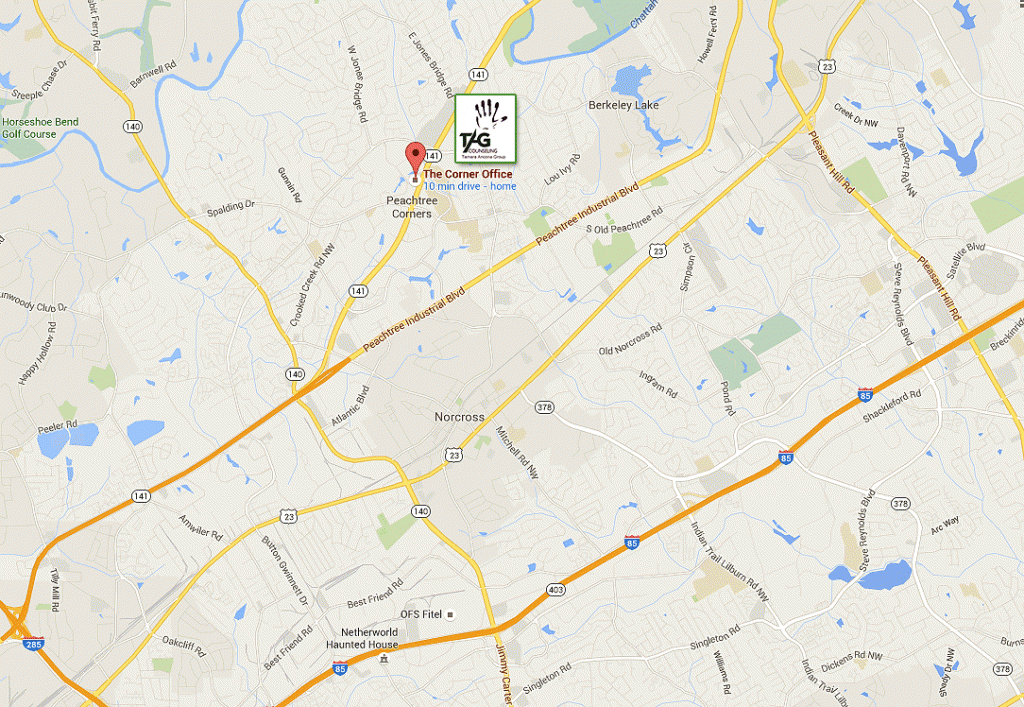 Directions to TAG Counseling From Hartsfield-Jackson Atlanta International Airport: Take I-85 N and follow directions below. From I-85/I-285: Take I-85 to I-285 West and exit 31B, Peachtree Industrial Blvd. (North). Go approximately 4-5 miles and the road will split (right past the Jimmy Carter exit), veer to the left on Hwy 141 (also known as Peachtree Parkway). Continue on Hwy 141 for approximately 3 miles, at which time you will see Spalding Drive (Bank of America then Wendy’s on your right, Shell Gas on your left ). Immediately after this intersection, The Corner Office Suites is on your left. Turn left onto Triangle Drive (by the Spalding Triangle Sign) and then the first right will be our office entrance (shared with Marriott Residence Inn). The Corner Office Suites address is 5425 Peachtree Parkway, Suite 142, Peachtree Corners, GA 30092. Enter the building and our staff will direct you to our office.